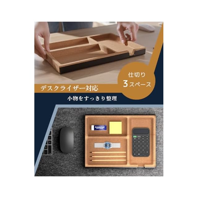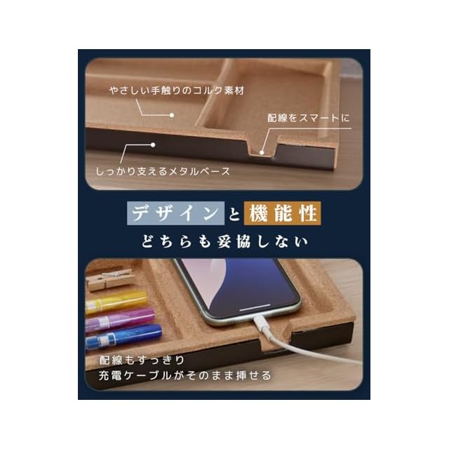 【 デスクライザー対応で快適な収納スペースを確保 】 デスクライザーやデスクスタンドの下にすっきり収まり、USB・SDカード・鍵・アクセサリーなどの小物を整理整頓。デスク上の散らかりを解消し、作業効率を向上させます。※カトラリーや日用品の収納にもご活用いただけます。ただし、コルク素材の特性上、水濡れや食品との直接接触にはご注意ください。