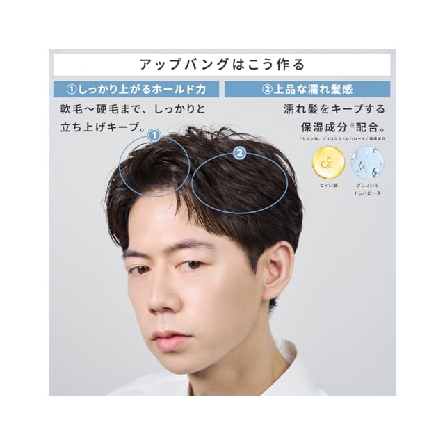 【商品特徴】<br><POINT.1>立ち上がり・ウェット感を長時間キープ。<br>アップバングやオールバックなど、上げスタイルを固めず自然に長時間キープします。<br>「ヒマシ油、グリコシルトレハロース、加水分解水添デンプン/保湿成分」配合で、乾燥した髪でも濡れ髪が持続。<br> <br><POINT.2>簡単な洗い落とし。<br>ワックスが髪に残りやすい方も、水溶性のグリースならお湯で落ちやすく、ノーストレスで洗い流しが可能。<br> <br><POINT.3>サロンの香り。<br>美容室帰りのような、石鹸調のさわやかで都会的な香り。