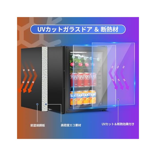 【断熱ダブルガラスドア】高品質な透明強化ガラスを採用したダブルガラスドアを採用しており、低温をしっかりとキープしながら省エネ効率と断熱効率を向上させます。中のアイテムが一目で確認できるクリアなデザインにより、無駄な開閉を省き、手間を大幅に軽減します。さらに、ダブルガラスドア部分は抗菌仕様を採用しており、紫外線を効果的に遮断し、常に清潔な状態を保つことができます。快適でエコなライフスタイルを実現するための理想的な選択です。