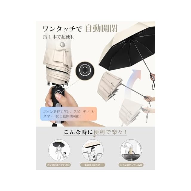 【らくらくワンタッチ自動開閉】新しいモデルおりたたみ傘では、ボタンを押すだけで、従来の折りたたみ傘 ワンタッチ自動開閉よりもスムーズに開閉でき、開く際の衝撃を大幅に軽減しました。また、自動閉じの動作も軽くなり、手動で柄を収納する際も楽に収めることができます。両手が塞がっている時でも、片手で簡単に操作できるので、車を降りる時や子供を抱っこしている時、荷物を持っている時など、非常に便利です。※折り畳み傘 をしっかりと根元まで押し込まないと ボタンを押しても動かない点は注意が必要です。