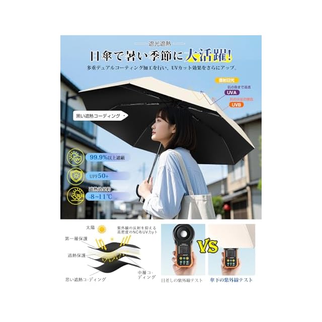 【UVカット&超撥水 晴雨兼用傘】この日傘 uvカット 100 遮光 折り畳みの内側には遮光遮熱コーティングを施され、遮光率100%、UVカット率99.9%に加えて、黒い裏生地が眩しさを軽減し、地面から反射する太陽熱を遮り、強い日差しの季節にも日傘として快適にご利用いただけます。さらに、本日傘 折りたたみは雨が染み込みにくい高密度生地を使用し、表面にはテフロン(Teflon)撥水コーティングが施されています。ひと振り、もしくは数回振るだけで雨粒をほとんど落とせます。満員電車に乗る時に傘の水滴で衣服が濡れないよう周囲への配慮もバッチリ。日差しも、雨も、強風も365日二れ1本!