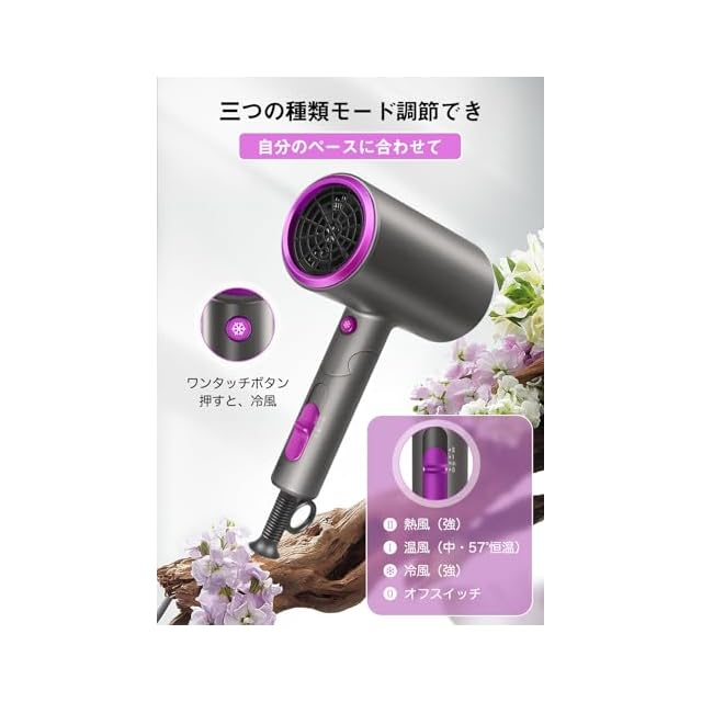 【熱風温風冷風自由に切替】ドライヤーは普通のドライヤーと違って、このヘアドライヤーは単なるの冷熱風だけではなく、様々な要求にそれぞれのモードを選択できます:【速乾モード】:熱風+大風量→髪を早く乾きたい方に適用、【ヘアケアモード】:57℃恒温+中風量→髪質を向上したい方に適用、【スタイリングモード】:冷風+大風量→付属品の吹き出し口のアタッチメントに合わせてお好きなスタイルを作ることができます。温度過昇防止装置が搭載され、温度が高すぎになったら電源が自動にオフになり、安全だし使いやすいです。