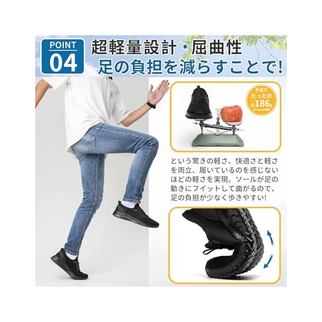立ち仕事靴 軽い:片足わずか約186gの超軽量設計で、まるで靴を履いていないかのような軽さです。EVA素材を使用したソールはクッション性に優れ、長時間歩いても足への負担を軽減します。立ち仕事や通勤、長時間の移動など、足を酷使するシーンでも、負担を感じさせない快適さが特徴です。軽くて疲れにくいので、毎日快適に過ごせます。