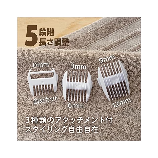軽さなんと110g。長時間使用しても疲れにくい!3種類・6段階(ナナメカット/0mm、3/6mm、9/12mm)の刈り高さのアタッチメントを付け替え、お好みの長さでカットできます。