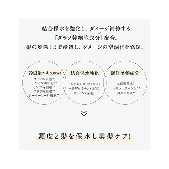 幹細胞エキス*と、海洋由来成分などを贅沢に配合した「タラソ幹細胞処方」の美容液シャンプーと美容液トリートメント。ダメージを受けたパサつきがちな髪に、水分を届けて束縛。乾燥しがちな頭皮も保湿して美髪作りをサポートし、髪がぷるんと潤い毛先までしっとりまとまります。キメ細やかでクリーミーな泡立ちのシャンプーが、頭皮と髪の汚れを優しく落としながら潤いを与えます。さらに美容液をリッチに配合したトリートメントで、ダメージによる毛髪の空洞化とキューティクルの剥がれを補修。使い続けるほど、髪の水分と油分のバランスを整え、潤いに満ちた「ぷるん髪」へと導きます。心地よく香るやさしいアクアホワイトフローラルの香り。* クリスマムマリチマムカルス培養液、リンゴ果実培養細胞エキス、ブドウ果実細胞エキス、アルガニアスピノサカルス培養エキス(全て保湿)