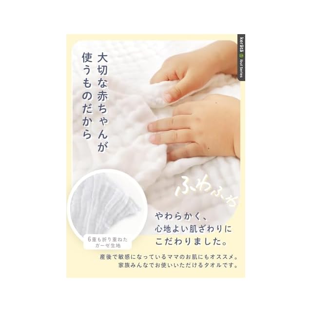 【ふんわり6重ガーゼ】大切な赤ちゃんに使うものだから、柔らかく心地よい肌ざわりにこだわりました。産後で敏感になっているママのお肌にもお勧め。家族みんなでお使いいただけます。
