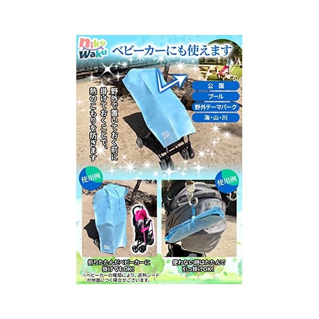 【コンパクトになる設計!】三つ折りにしてクルクルと丸め、付属の紐を巻きスナップボタンで留めればコンパクトに!先端が輪になっているので引っ掛け収納も可能です。【ベビーカーにも!】野外へお出かけの際、ベビーカーからお子様を連れて離れる際、ベビーカーを放置する場面にも遮熱シートを掛けておけばOK! 公園、プール、テーマパーク、海、山、川など携帯してお使いいただけます!【】安心安全の45日間書を付属いたしております。 不良や故障の際には、スタッフが誠心誠意対応致しますので、お気軽にお問い合わせ下さい。 迅速に返金、もしくは新品の再配送をさせて頂きます。【サイズ】ヨコ約74cm ×タテ約95cm 裏面袋状部分約20cm ※サイズは手測りの為、若干の誤差が生じますのでご了承ください。 ヒモ長さ約31cm 引っ掛け部分の輪長さ約4cm【素材】ナイロン/ポリエステル ウラ:オックスフォード/シルバーコーティング【カラー】ブルー(裏面シルバー)
