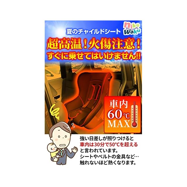 【真夏の車中 高温の座席対策!】真夏の炎天下で駐車した後の車内は、エンジン停止後わずか30分で約50℃を超えるといいます。チャイルドシートにはベルト金具などもあり、その部分は火傷になるほどの高温に!車から離れる前に、nikowakuの遮熱シートをサッとかけるだけで熱を遮断し、チャイルドシートの温度上昇を防ぎます。