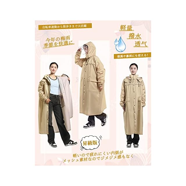 【2025新型・おしゃれ構造軽量で蒸れないメッシュ付きレインコート レディース】急な悪天候の時にもすぐにご利用いただけるファスナー&シール式のを採用しています。安心で便利に、着脱ぎしやすいアイテム。市場のレインコートと違って、弊店のレインコートは高品質のポリエステル素材を使用し、長年ご利用いただけます。自転車 原付におすすめ!リュックを背負ったまま着れる!雨の日でも安心安全な機能がもりたくさん:①裏地にはメッシュ設計を使用しなって、真夏や梅雨などの天気での長時間着用にもベタつきなし!②嬉しいフェイスカバー付き!③フードにはサイズを調節可能なマジックタイプ仕様:頭のサイズに合わせて調整可能。また雨水の侵入も防止します。④前身頃に大きめなポケツトを2個デザインで、ちょっとした小物や折りたたみ傘の収納にも便利。⑤後ろ身頃には3角形のマチ付きデザインを使用し、リュックを背負ったままでも自転車をこいいただけます。そして夜間外出にも安全な反射ラインがついております。⑥フードは取り外しが容易なスナップボタンを採用しており、必要に応じて取り付け&取り外しが可能。