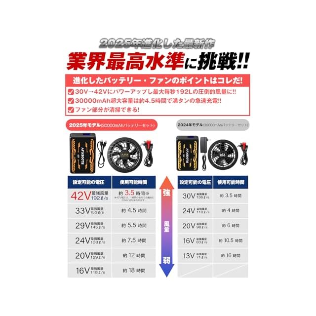 【186L/S究極風力・6段階風速調整】42Vで最大192L/Sの風量を実現、瞬時に冷却!42Vから16Vまで、6段階風量切替もご用意!