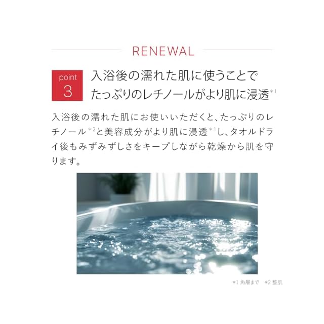 【入浴後の濡れた肌にも】濡れた肌にお使いいただくことで、たっぷりのレチノールと美容成分がより肌に浸透します。