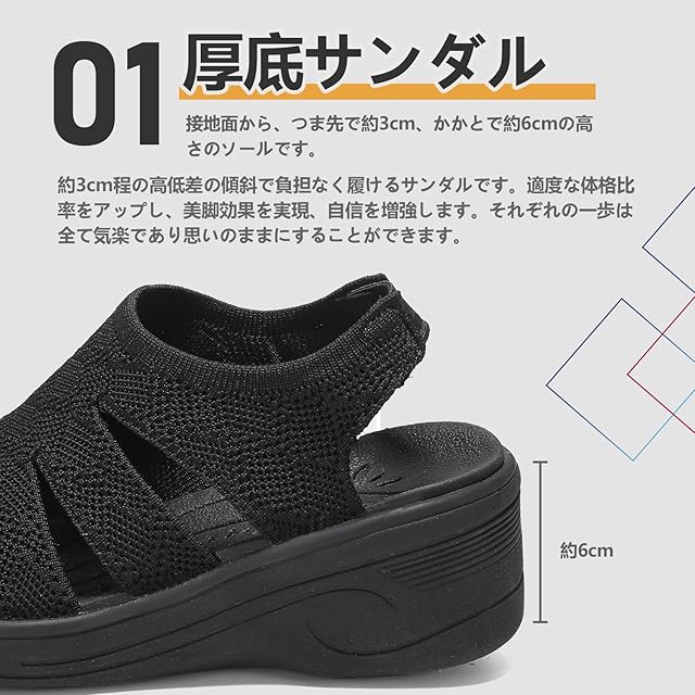 【履きやすい厚底サンダル】接地面から、つま先で約3cm、かかとで約6cmの高さのソールです。約2cm程の高低差の傾斜で負担なく履けるサンダルです。適度な体格比率をアップし、美脚効果を実現、自信を増強します。それぞれの一歩は全て気楽であり思いのままにすることができます。