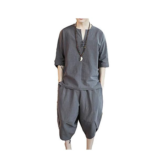 商品名:[foveitaa] 夏服 メンズ 部屋着 和風 服 Tシャツ 七分袖 麻 シャツ 半袖 上下セット トップス ハーフパンツ ショート パンツ 上下 Vネック 和式パーカー セット アップ 無地 柄 Gray L