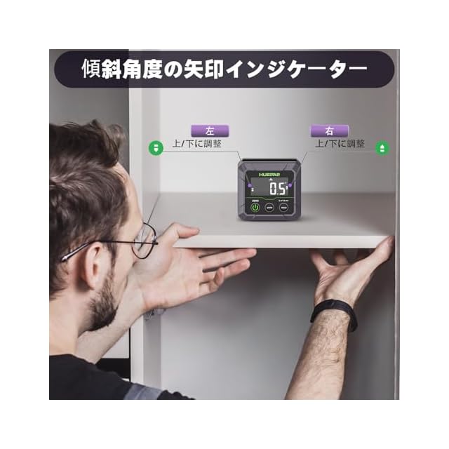 【スマート傾斜インジケーター付きプレミアムVA LCD】高コントラストのVA LCDディスプレイで、明るい環境でも明瞭に読み取れます。 4 つの測定単位 (度、パーセンテージ、mm/m、インチ/フィート)、相対/絶対測定、データ保持、ゼロ調整、傾斜表示、自動シャットオフ、低バッテリー警告など、8 つの基本機能。さらに、画面には傾斜矢印が表示されるため、偏差が最小限で目で確認しにくい場合に正確な調整を行うことができ、優れた精度がされます。