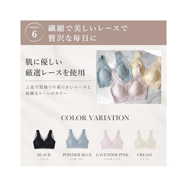【厳選素材】サイドから背中まで無縫製シームレス生地採用、肌触りがよく柔らかい。通気性もよく、さらさらとした着心地。繊細で美しい厳選レースを胸部にあしらい、とろけるような柔らかい肌触りの生地とあわせ、優しく贅沢な雰囲気に。