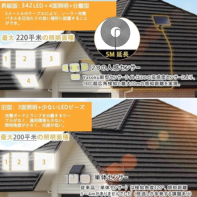 商品名:Yasoku ソーラーライト 分離型 センサーライト 屋外 防水IP65 【342LED・極高輝度版・大型太阳能板10×20cm・2つの人感センサー・5M延長コード・4面発光】3つ点灯モード 防犯 2600mAh大容量電池 自動点灯/消灯 ガーデン/玄関/壁掛け/庭/駐車場/停電時適用 地震/台風/津波/防災に対応 リモコン付き 日本語説明書付き
