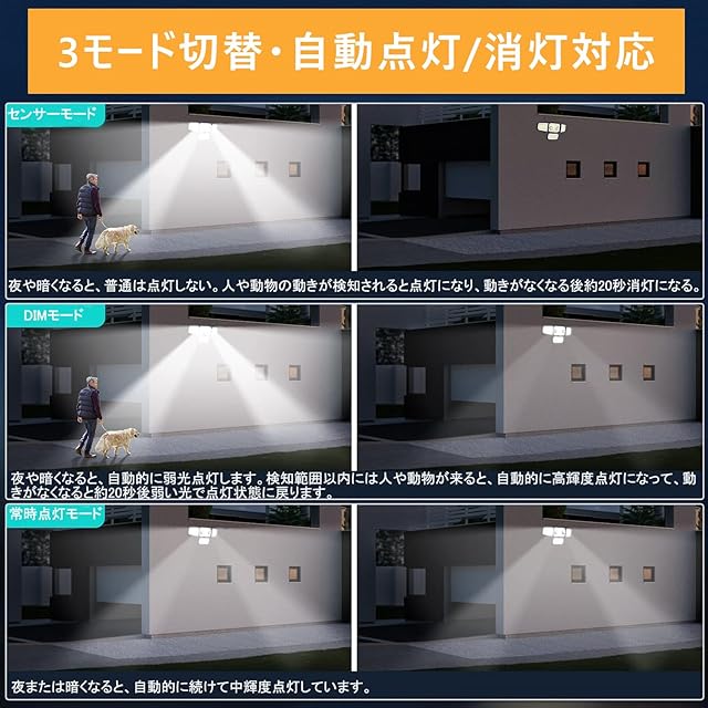 【リモコン操作・3モード切替・自動点灯/消灯対応】この人感センサーライトは付属リモコンで3つの智能モードを簡単に切り替えられます。● 人感センサーモード:夜や暗くなると、普通は点灯しない。人や動物の動きを検知すると点灯,動きがなくなってから約20秒後に自動消灯。● 省エネナイトモード:夜や暗くなると、自動的に弱光点灯します。人や動物を検知すると高輝度に切り替わり。動きがなくなると約20秒後弱い光で点灯状態に戻ります。● 常夜灯モード:暗くなると自動的に中輝度で点灯(常時点灯)。必要な時にだけ自動点灯しますので、エネルギー効率が高く省エネであり、長時間ご使用いただけま。※日中はライト本体とソーラーコネクターを接続すると充電状態となるため、点灯しない仕様です。日中に点灯が必要な場合は、接続プラグ(コネクター)をお抜きください。夜間になると自動点灯します。