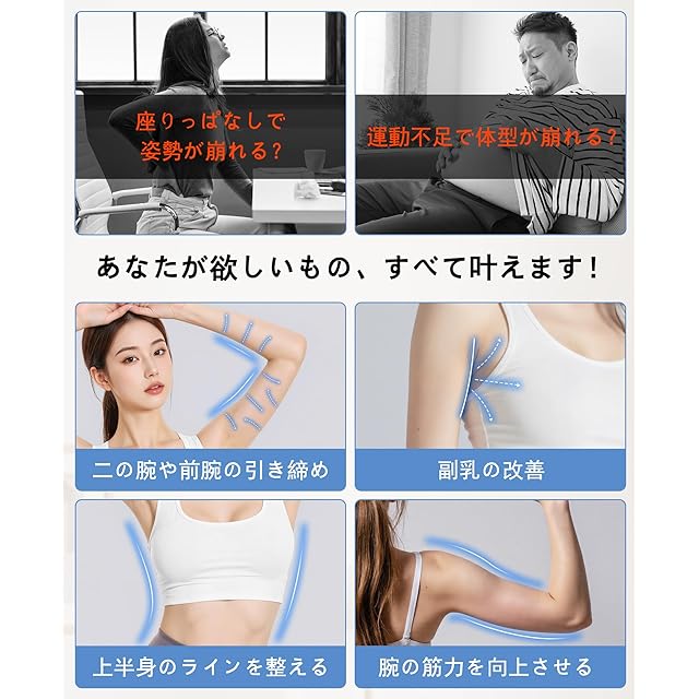 長時間のデスクワークや運動不足で姿勢や体型が気になる方にぴったりのアイテムです。この前腕トレーニング器具は、肩や腕まわりの筋肉を効果的に鍛え、二の腕や前腕の引き締め、副乳の改善、さらにはバストアップもサポートします。前かがみ姿勢による肩や首の不調の緩和にも効果が期待できます。継続使用で、美しい姿勢とバランスの取れたスラリとした腕を目指せ、日常の中で手軽に“スワンアーム”を叶えます。