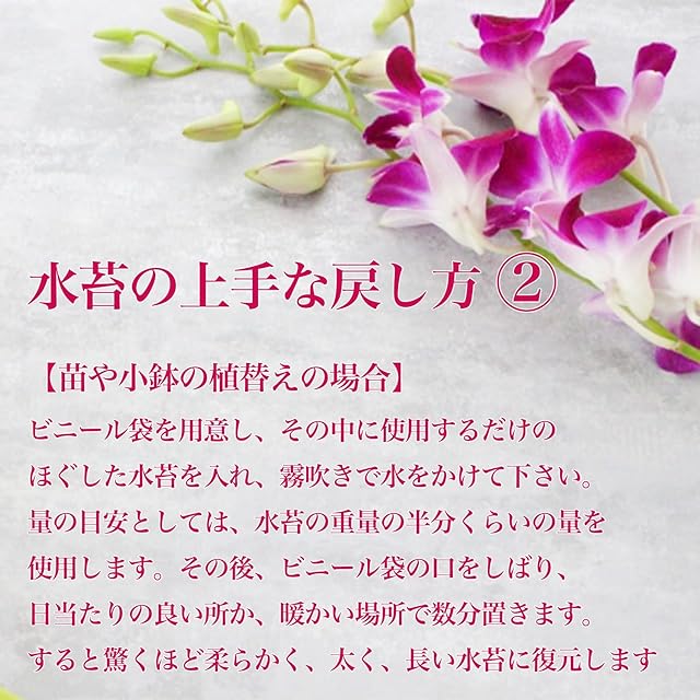 【基本的な使い方】植え替え時の古い水苔は取り除いてください。水苔は使用前に水に浸し、軽く絞ってお使いください。柔らかく、太く、長い水苔に復元するには、使用する量によって戻し方が異なります。