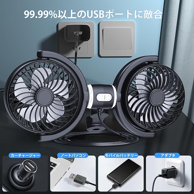 商品名:OFFEREE 車 扇風機 車内 車用 カーファン USB式 静音 車内 後部座席 ファン 3段階風量調整 360°角度調整 独立スイッチ 強風 車載扇風機 車中泊 熱中症対策 双頭 ヘッドレストファン 車せんぷうき 取付簡単 長配線 USB給電