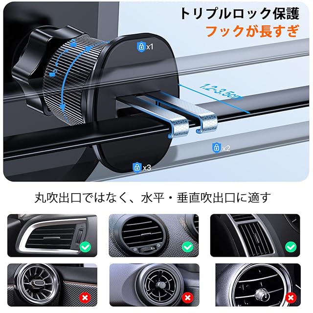 【幅広い互換性】車載スマホスタンドは、幅広と奥行きの調節可能なロックアームを備えており、iPhone/Xperia/Samsung/AQUOSなどの各種なスマホ(4.0-7.0インチ)に対応し、厚いケースにもぴったりとフィットします。本車載スマホホルダーは水平および垂直ベントの通気口に対応しますが、円形の通気口には適していないのでご注意ください。