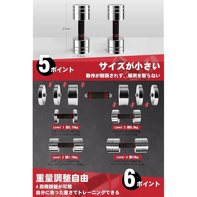 【多段階重量変更簡単】1つのダンベルは、(初心者から上級者まで)様々なトレーニングニーズに対応するため、複数の重さを調整できるので、複数のダンベルを買う必要はなく、自身のトレーニングに適した重量を選ぶことができます。ナットレスデザインは、ダンベル・プレートを緩めるだけで素早く重量を調整できます。めねじ構造を採用していますので、すべてのプレートをハンドルに取り付けることが可能です!自由に組み合わせ、自分好みのダンベルを使用しましょう!レベル①2.75kg:女性のヨガやボディスカルプティングに最適です。レベル②5.5kg:初心者の方向けです。レベル③7.75kg:重量アップで筋トレする方におすすめです。レベル④10kg:プロの方にぴったりです。