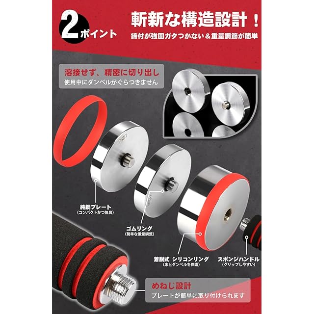 【強固で丈夫&使い心地抜群】ダンベルプレートは溶接せずに、高品質な一つの鋼材から精密に切り出しました。各プレートは互いに固定されているため、従来のダンベルにありがちなナットの緩みによるプレートのガタつきを回避できます。セッティングが簡単なだけでなく、プレートが外れない心配がございません。ハンドルは発泡素材製で、グリップしやすく、手を傷めない安全な滑り止め付きです。また、重さによる手の痛みも軽減され、ご安心して筋トレに集中できます。安全性が高いです。