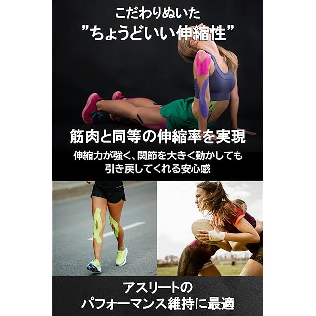 【 痛みや不安のある身体の部位に 】指・手首・肘・ふくらはぎ・肩・膝・太もも・腰 等様々な箇所にご使用いただけます。独自開発のストレートスリット加工(SS-Processing tm)で粘着面を限界まで広げたことにより””とにかく剥がれにくさ""を最重視いたしました。保持力試験の他社比較で最大2.4倍はがれにくいテープに仕上がっております。