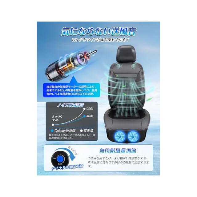 商品名:Cakoey クールシート 車 シートクーラー【2025新登場 2枚超大型ファン DC12V/24V対応】無段階風量調整 夏用 蒸れない 通気性向上 滑り止め 簡単装着 熱中症対策 日本語説明書付き (40個送風穴+首元2個吹出し口)