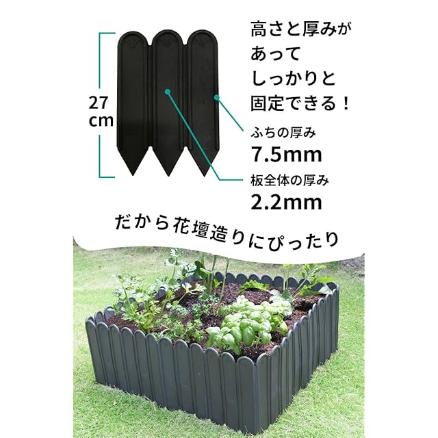 【本体サイズ】(約) 高さ27cm×長さ3m 【用途】芝の根止め、花壇作りに。お隣りへの土の流出を気にせず簡単にガーデニングが楽しめる。ぐるっと囲うだけで野菜畑も簡単に作れます。