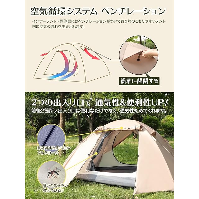 【広さ&快適性】4人テントです。インナーサイズ:210*210*120(cm)3畳の広い内室です。クイーンサイズベッドのように広々としており、大人2人プラスお子さんでも余裕で,4人用の広いスペースです。ソロキャンプで使えば、寝床だけでなく、荷物置き場も確保できます。他社のテントのような、幅が狭くてキャンプコットを置くこと或いは寝返りをうつことができないといった心配がありません!