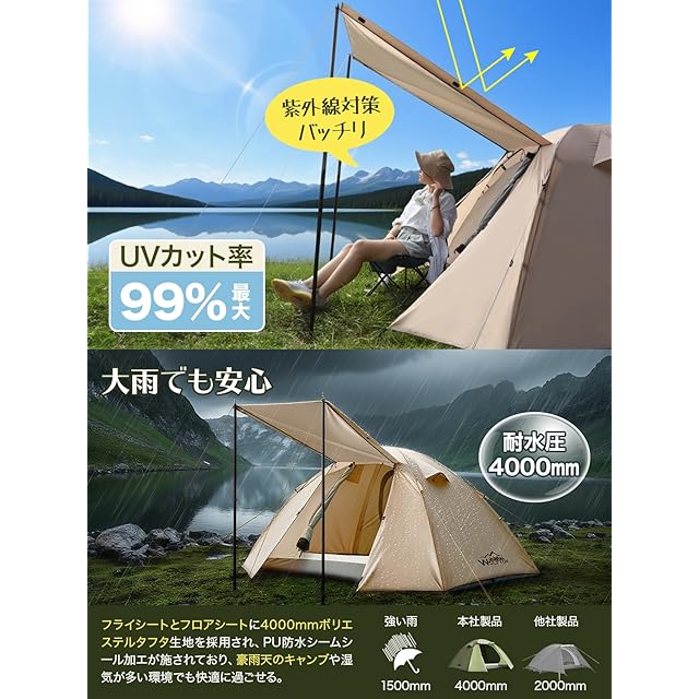【全天候対応】このテントは耐水圧4,000mmの高密度ポリエステルタフタ生地を採用しており、PU防水シームシール加工が施されているため、突然の雨や梅雨時のジメジメした天候でも完全防備できます。特に5月の天候が崩れやすい時期や昼夜の寒暖差が激しい季節でも、四面メッシュ仕様のインナーテントが通気性を確保し、蒸れを軽減します。標準装備のインナーマットにグランドシートを追加すれば、秋冬の冷え込みもシャットアウトできる優れものです。耐水圧性能と通気性を両立したこのテントなら、季節を問わず快適なキャンプが楽しめます。防災にも適用します。