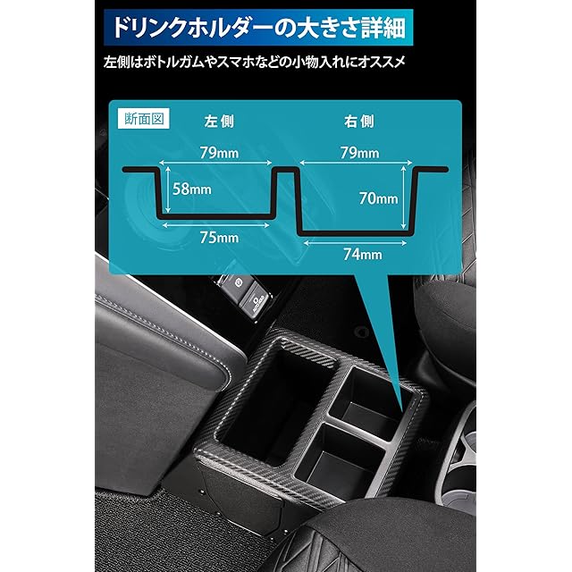 【深さの違う2つのドリンクホルダー】 本製品は左右のドリンクホルダーで深さが異なります。左のドリンクホルダーの深さが約58mm、右のドリンクホルダーの深さが約70mmになります。 背の低い容器でも浅いドリンクホルダーに入れることによって取り出しやすくなります。そのため浅い左側には背の低いボトルガムを置いて、深い右側にはドリンクを置く等の使い方が便利です。 一方で、背の高いペットボトルなどを浅い左側のドリンクホルダーへ置くと不安定になる可能性があります。