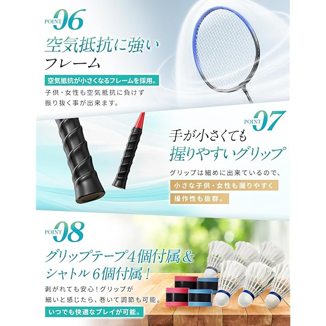 こちらの商品はバドミントンラケットです。初心者から中級者まで幅広くおすすめできるラケットです。初心者から中級者の方がプレーしやすい設計となっております。 こんなお悩みございませんか? 初心者はどのラケットから始めたらいいかわからない、、、 似た商品が多くて何で選べばいいのかわからない、、、 小さな子供、女性、ご高齢者でも安全で楽しめるものが欲しい、、、 家族みんなで公園や旅行先で遊べるレジャー用に欲しい、、、 百均やホームセンターの物より品質が良い物を欲しい、、、 子供や孫へのプレゼントをどうしよう、、、 そのお悩みおまかせください! Point01子供・女性も振り抜ける超軽量ラケット! 当製品は約100グラムとだいたいおにぎり1個分程度の重さなので子供、女性、ご高齢者も疲れず楽に扱えます。 Point02 力が弱くても遠くに飛ばせるシャフト! 柔らかいシャフトを使用してるので、しなる反動により軽い力でも簡単に遠くに飛ばせるので力の弱い子供、女性でも楽しめます。 Point03 苦手な方でも簡単にミート出来る特大スイートスポット! ガットの張りを強くしすぎない事によって、スイートスポットが広くなり、どこに当たっても飛びやすく、ミートしやすいので運動が苦手な方でも楽しめます。 Point04 初心者・女性も扱える自由自在な操作性! ラケット全体の重さバランスが均等に作られています。そのバランス設計により操作性が良く、ミート、コントロールもしやすいので老若男女楽しめます。 Point05 長年愛用出来る長寿命設計! T型ジョイントを内臓する事で、ねじれを大幅にカット、結果、面の安定性を高め、耐久性能も大幅に向上するので長年愛用できます。 Point06 空気抵抗に強いフレーム! 空気抵抗が小さくなるフレームを採用。子供・女性も空気抵抗に負けなく振り抜く事が出来ます。 Point07 手が小さくても握りやすいグリップ! グリップは細めに出来ているので、操作性が良く、小さな子供・女性も握りやすいです。 Point08 グリップテープ2個付属! もしグリップテープが剝がれても安心。また、グリップが細いと感じたら巻いて調節も可能。 ✅【使用上の注意】 ・周囲の安全を確認して使用してください。人や障害物に注意し、十分なスペースを確保してください。 ・屋内で使用する際は、天井や照明器具にラケットやシャトルが当たらないように注意してください。 ・小さなお子様が使用する場合は、保護者の監督のもとで遊ばせてください。 ・乱暴に振り回すとケガの原因になりますので、適切な力でプレーしてください。 ・強風時や悪天候の中での使用は避けてください。 ・本来の用途以外には使用しないでください。 ・万が一、異常を感じた場合は使用を中止してください。