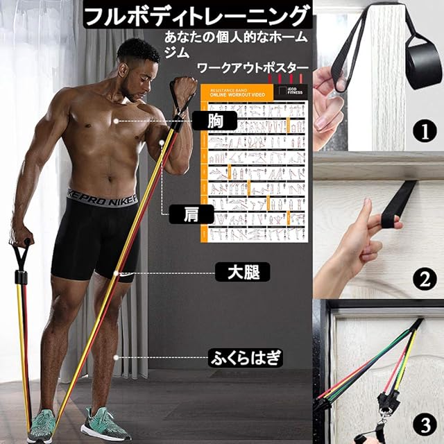 製品内容:5 xトレーニングチューブ、2 x ソフトクッションハンドル、2 x ドアアンカー アンクルストラップ、1 x ドア・アンカー、1 x 収納袋、1x説明書、1 x ギフトボックス。初期不良および正常な使用範囲内で自然発生した故障、破損、その他の不具合があった場合、カスタマーサービスや弊社の公式ホームページに連絡して返品/返金の受付は可能です