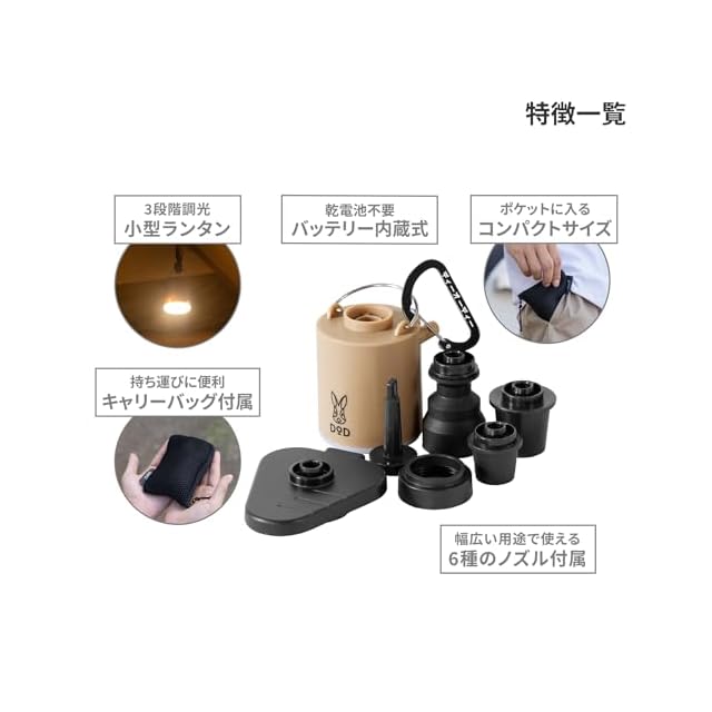 セット内容:製品本体、キワミノズル、サソイノズル、ハンペンノズル(大)、ハンペンノズル(小)、アッシュクノズル、ウキワノズル、充電ケーブル、カラビナ、キャリーバッグ