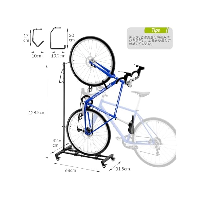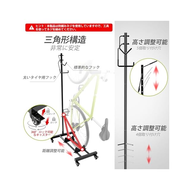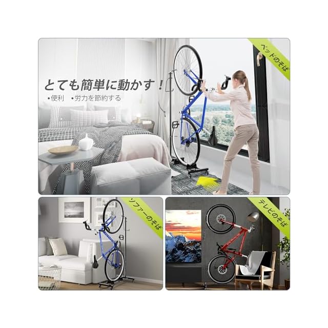 【ロック可能なキャスターの設計追加】:360度回転する4つのキャスターを備えたこの直立型自転車スタンドは、屋内外の任意の場所に簡単に移動できます、キャスターは滑りを防止するためにロック可能です。キャスターの設計は駐輪スタンドの重量を分散し、スタンドの移動時の負担を軽減します。キャスターにより安定性が向上し、駐輪時に自転車スタンドが偶発的に倒れることがないようにし、自転車の安全性と完全性を保護します。