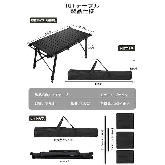商品名:「次世代 組立不要IGTテーブル 」 アウトドアテーブル キャンプテーブル 折り畳み 高さ43~66cm調節可能 吊り下げ用サイドレール付き アルミ 軽量 3ユニット コンパクト igt対応 焚き火テーブル マルチキッチンテーブル バーベキュー 収納袋付き(ブラック)