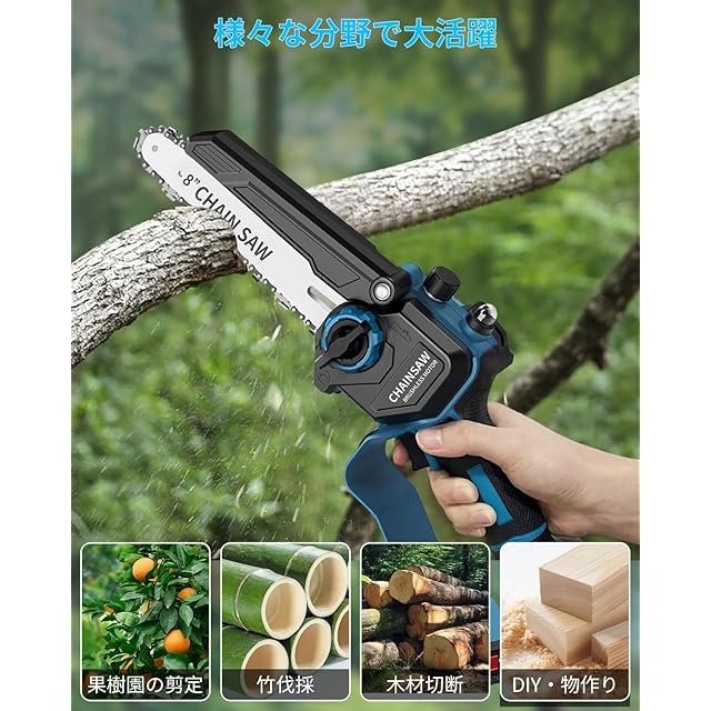 商品名:チェーンソー 充電式チェーンソー【2025年最強・9m/sブラシレスモーター・8インチ&6インチ・切断径15-20cm】自動給油ハンディチェーンソー 2個2.0Ahバッテリー 電動チェーンソー 軽量 強力 ミニ 小型チェーンソー ハンドチェーンソー ツール不要 安全ロック コードレス 竹・枝切り 庭木の剪定 薪作り 林業伐採 手袋 ゴーグル ボトル 替え刃 ケース付き 日本語説明書 PSE認証済み