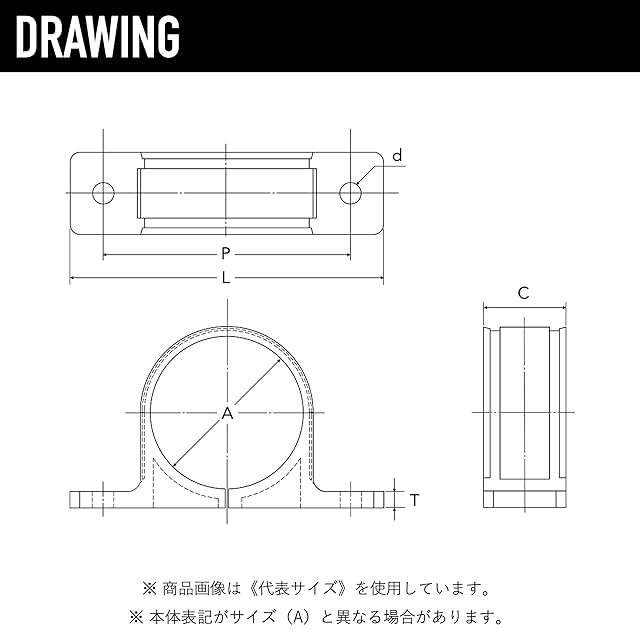 【商品寸法】A:48.6mm|C:25mm|L:100mm|P:82mm|T:7mm|d:6.5mm|適合台座サイズ:5号 ※取り付けるパイプの外径(直径)に合わせて適切なサイズをご選択ください。