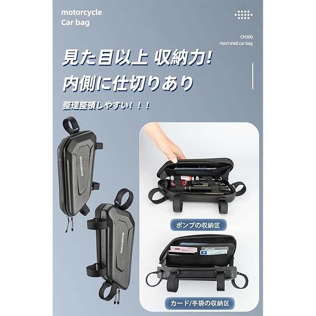 【1.5L大容量&仕切り】スリムなのにバイクサイドバッグが見た目以上の収納力を備えて、携帯空気入れ、鍵、財布、イヤホン、腕時計からモバイルバッテリーまでしっかり収納できます。最大限は550mlのペットボトルまで収納できます!バッグの内側に仕分けの収納スペースが付いていて、収納する時に小物が混乱している状態が避けらて整理もしやすいです!