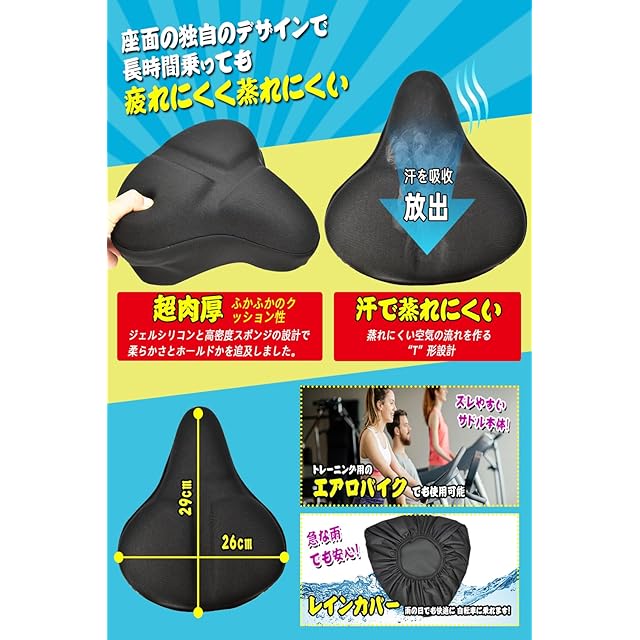 サドルに5cm超極厚のクッションカバーを装着する事によって、衝撃を吸収し、お尻の痛みを軽減します。高性能素材PVC等、最高品質の強度を実現しながらも、最高のクッション性、軽量性、防水性、断熱性と使い心地にもこだわりました。本商品は、サドルに超極厚のクッションカバーを装着する事によって、衝撃を吸収し、お尻の痛みを軽減します。自転車サドルに装着するだけで、自転車サドルのクッション性が向上し、お尻の衝撃を吸収します。高密度なポリウレタンと高性能素材PVCの使用で、お尻に優しく高クッション性と安定性を実現しました。水に濡らさずにお乗りいただけます。