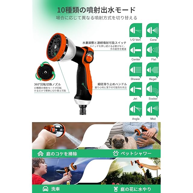 【10種類の散水モード&使いやすい散水ノズル】 散水ホースのノズルは10-in-1設計で、10種類の散水モードがあり、使用シーンに応じて散水モードを切り替えることができます。 例えば、庭の花の水やり、洗車、地面のコケ掃除などの場合、水圧と散水量を切り替えることで効果を発揮します。 また、スイッチを長押しする必要がない設計なので、長時間使用しても手のひらが疲れにくいです。 散水ノズルのハンドルには滑り止め加工が施されており、水に触れても落ちにくいです。 ホースのノズルも使いやすさを追求したデザインです。