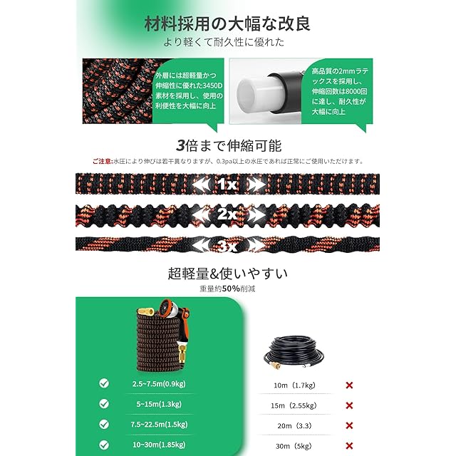 【高品質ラテックスを採用&優れた伸縮性】3倍伸縮ホースは、従来品を改良しました。 伸びるホース内層には伸縮性と回復性に優れた高品質2mmラテックスを採用し、伸縮ホースの耐久性と使用時の伸縮速度が向上しました。 外層は耐摩耗性に優れた3450D素材で作られており、伸びるホースが硬い路面を引きずったときに内側のラテックスが傷つくのを防ぐ。 また、伸縮ホースは-10℃~60℃の環境下で1~3倍の長さに伸ばすことができます。多くの地域で、いつでも問題なく使用できる。