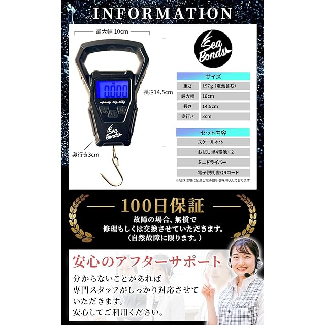 商品名:SeaBonds フィッシングスケール 防水 デジタルスケール 釣り IPX7 日本ブランド 100日 スケール 吊りはかり 吊りスケール デジタル秤 釣りはかり Gスケール 計測ツール アウトドア 軽量 50kg バックライト付 ドラグチェッカー 説明書付き (ブラック) シーボンズ