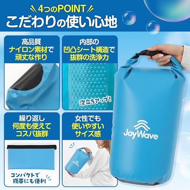 「JoyWave」の洗濯袋は、旅行先・出張先やアウトドアで活躍するコンパクトに折りたたみ可能な洗濯袋です。荷物を減らしたい、旅行先で服を汚してしまった、キャンプ場で洗濯したい等々、あらゆる場面で大活躍!付属のセームタオル使用で乾燥時間を短縮可能です。(セームタオル使用後は、広げて乾かしてください)