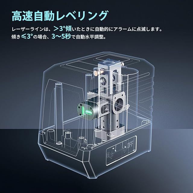 Janmiflyレーザー墨出し器は、小型で持ち運びが簡単です。±3°の自動整平機能と、3段階の調光機能を備えています。動水平機能と手動モードも搭載されており、高輝度で高精度な作業が可能です。日本語の説明書が付属しているので、初心者でも簡単に使用できます。コンパクトながら多機能なレーザー墨出し器で、プロフェッショナルな仕上がりを実現します。