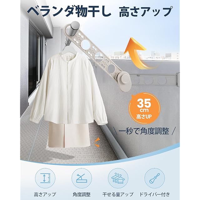4.【高さアップ&布団干し】:長い衣類を干すとき、よく床について汚れるという場合がございますが、本製品を取付後、丈が長い衣類やシーツを干すとき、衣類の高さを最大35cm高くすることができ、2本竿を通せば、乾燥スペース不足の問題を効果的に解決し、布団も干せ、外干しの悩みが一気に解決!