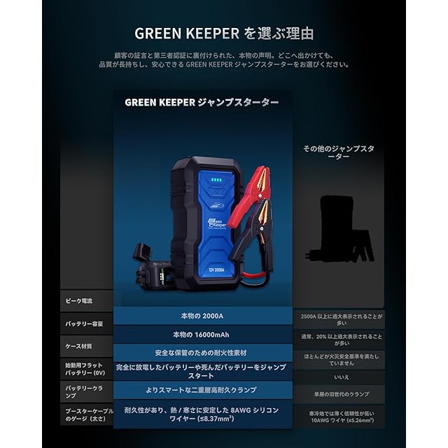 商品名:ジャンプスターター12V 2000Aピーク1000Aスタート電流 最大7.0Lガソリン車・6.5Lディーゼル車兼容 エンジンスターター バッテリージャンプスターター 16000mAh 59.2Wh大容量リチウムバッテリー 安全PSE認証済 QC 18W 快充 LED照明緊急SOSストロボ機能付き 軽自動車 普通車 バイク 小型船舶対応 多重智能安全保護 軽量便携デザイン