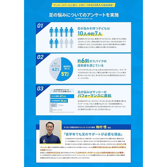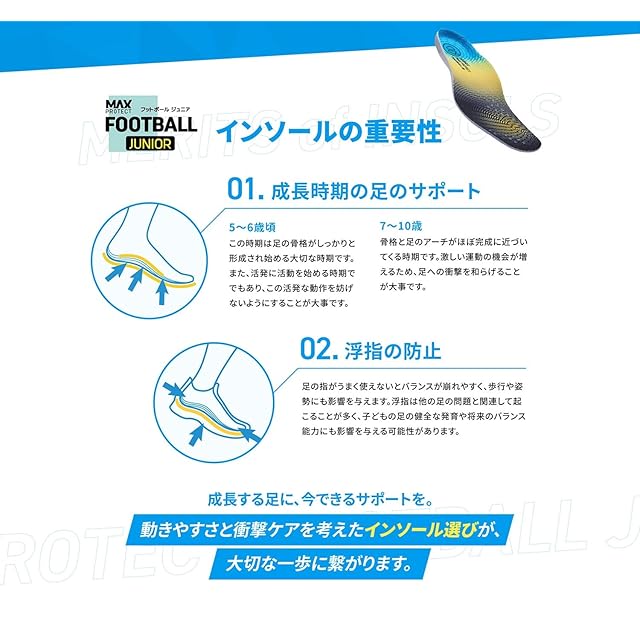 成長期の足、知らないうちに負担をかけていませんか?小学校低学年からサッカーを始めるお子さまが多く、成長とともにケガの発生率も増加します。成長する足に、今できるサポートを。動きやすさと衝撃ケアを考えたインソール選びが、大切な一歩に繋がります。